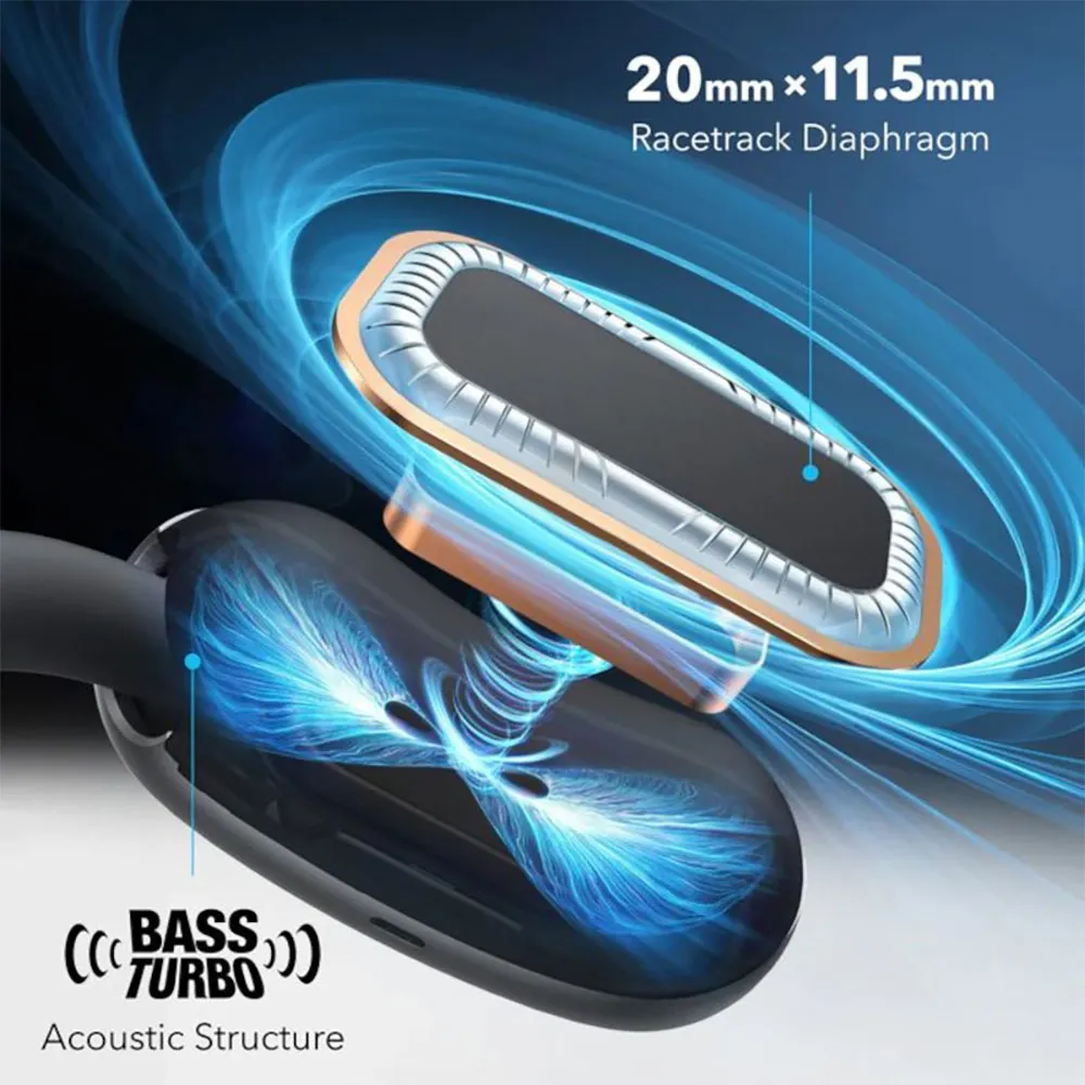 Design Open Ear - Doppio Driver - Struttura Acustica BassTurbo - 4 microfoni e chiamate potenziate dall´IA - Sport - Gancio - IP55 - Suono 3D - Fino a 42 ore con custodia di ricarica - Nero.