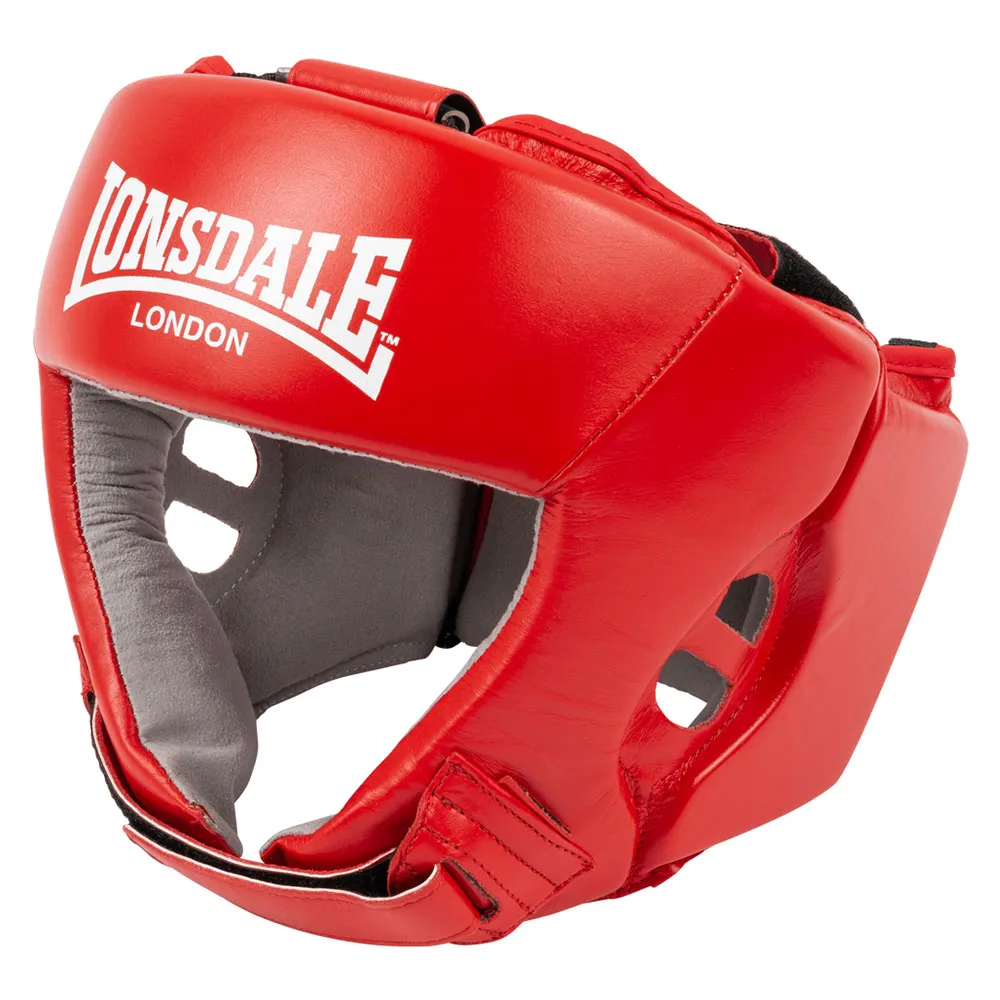 Denne CE-sertifiserte hodestøtten fra Lonsdale er spesiallaget for profesjonelle konkurranser i den tyske bokseorganisasjonen (DBV) og er lisensiert av DBV. Størrelsesinformasjonen er tydelig synlig på baksiden. Hodestøtten er håndlaget av høykvalitets okseskinn og har øre-, hake- og kinnbeskyttelse samt flerlags polstring for høy klemmeabsorbsjon. Velcro-lukningene i hake og bakhodet sikrer individuell tilpasning til alle hodeformer.
