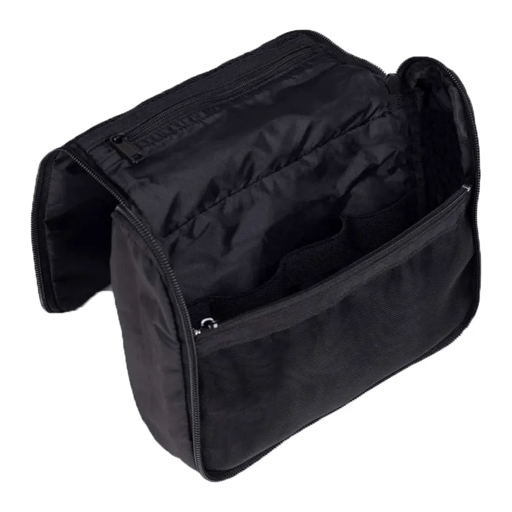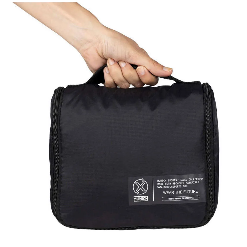 Reisetoalettmappe laget av gjenvunnet polyester. Interiøret har en krok for oppheng, en glidelåslomme foran og to lommer på lokket. Interiøret inkluderer strikk for å holde diverse gjenstander.