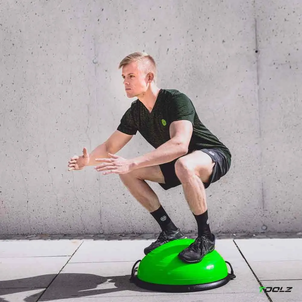 TOOLZ Balanseball er det perfekte treningsverktøyet for en effektiv fullkroppstrening. Ved å kombinere styrke, koordinasjon, reaksjon og balansetrening, forbedrer den muskelstabiliteten. De flate og buede sidene tilbyr allsidige treningsmuligheter, mens de integrerte treningsslangene spesifikt styrker overkroppen. Den medfølgende luftpumpe muliggjør individuelle vanskelighetsjusteringer. Skaff deg din TOOLZ Balanseball nå og optimaliser din funksjonelle trening, balanse og kjernestabilitet – enten hjemme eller på treningssenteret!