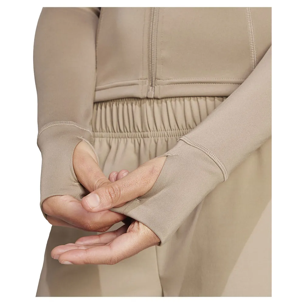 It´s made from stretchy fabric with thumbhole sleeves and a mock neck.