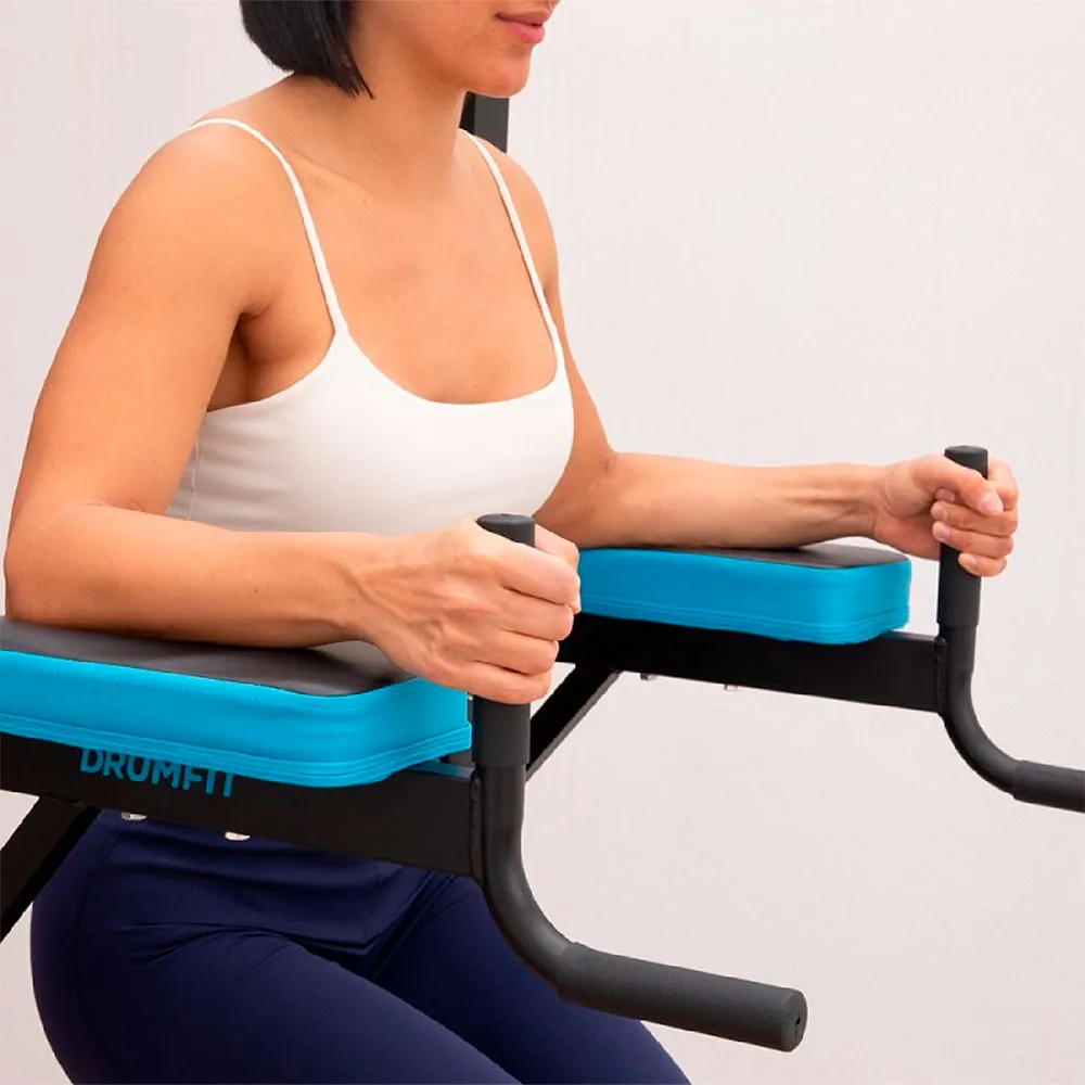 Torre de Força Drumfit PullUps 4000. Multi-estação para treinamento de força. Torre de barra fixa e paralelas. Acolchoada e com pegas antiderrapantes. Altura ajustável. Peso máximo 120 kg.
