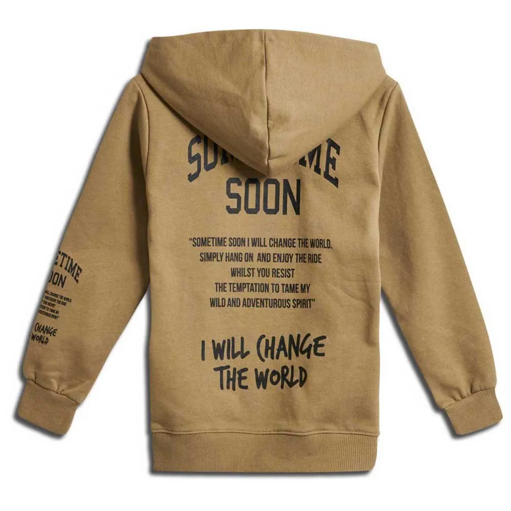 Construído com um tecido de mistura de algodão orgânico, o design deste hoodie apresenta as clássicas estampas “Sometime soon I will change the world” na frente, nas costas e na manga.