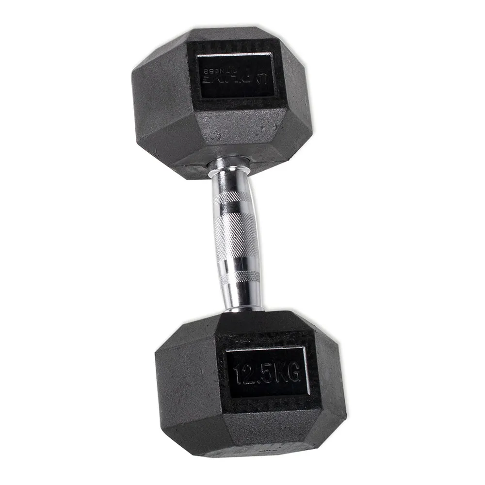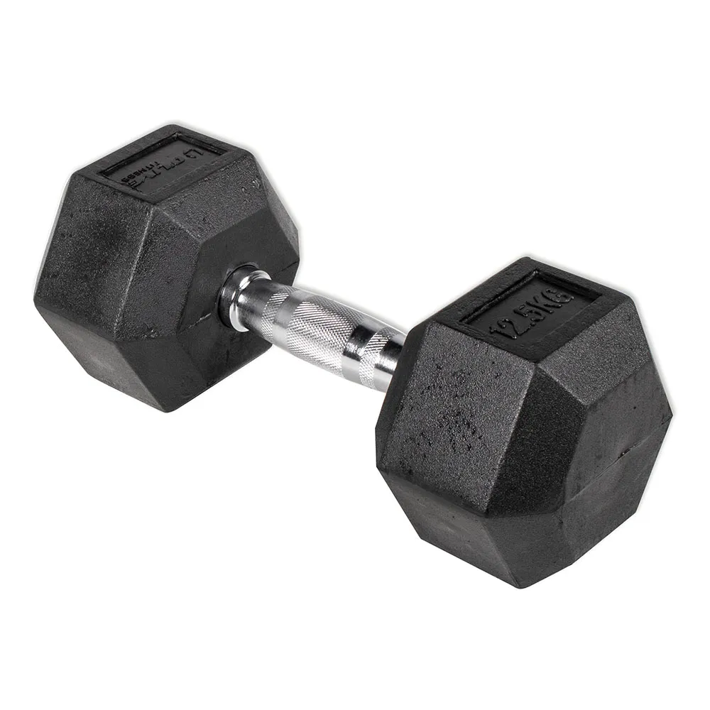 Halteres com formato hexagonal, pegada levemente contornada, revestimento de borracha, alta durabilidade. Permitem exercícios no chão, bem como levantamento.