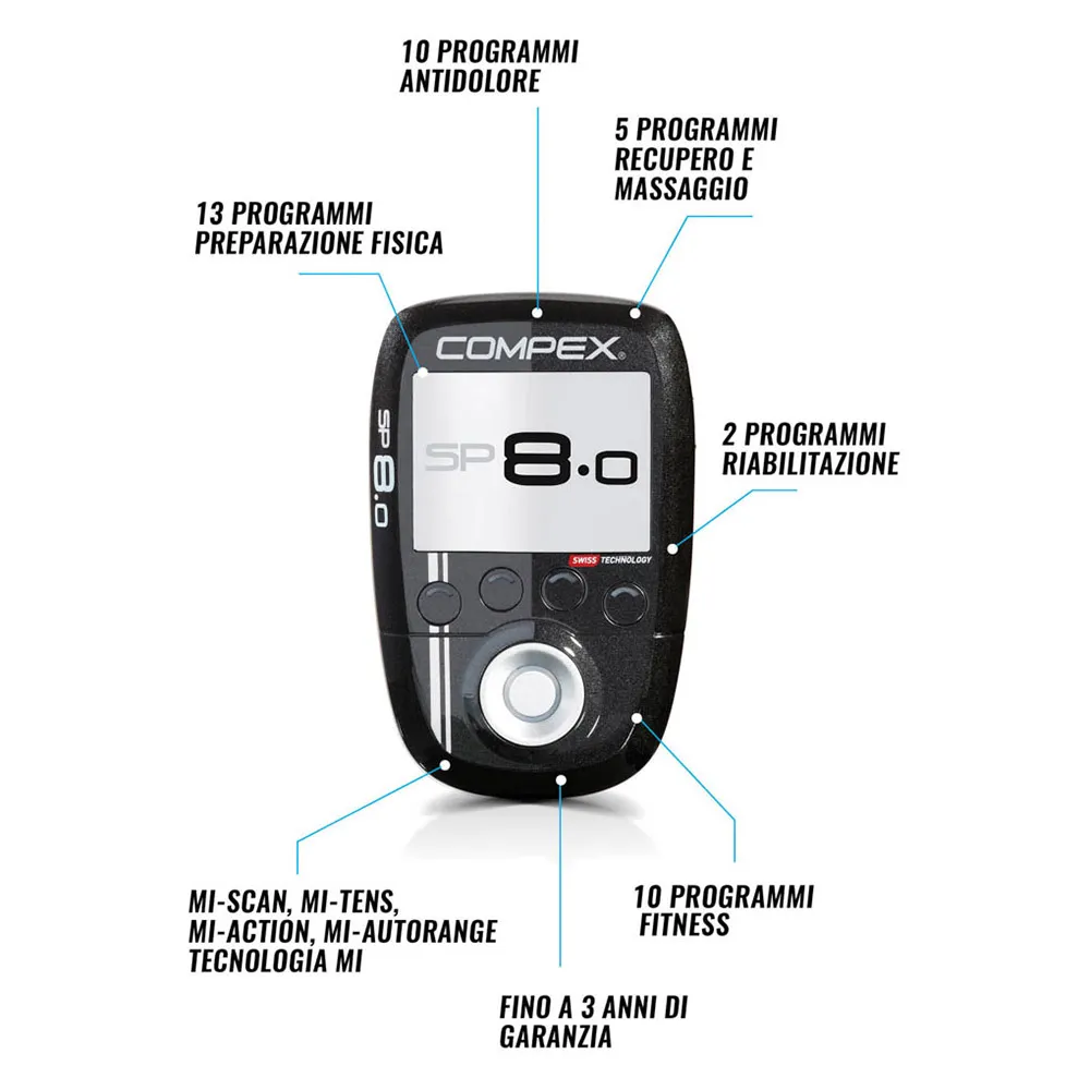 Den trådlösa muskelstimulatorn Compex SP 8.0, utrustad med 40 program, är skräddarsydd för dedikerade idrottare som tränar och tävlar ofta.