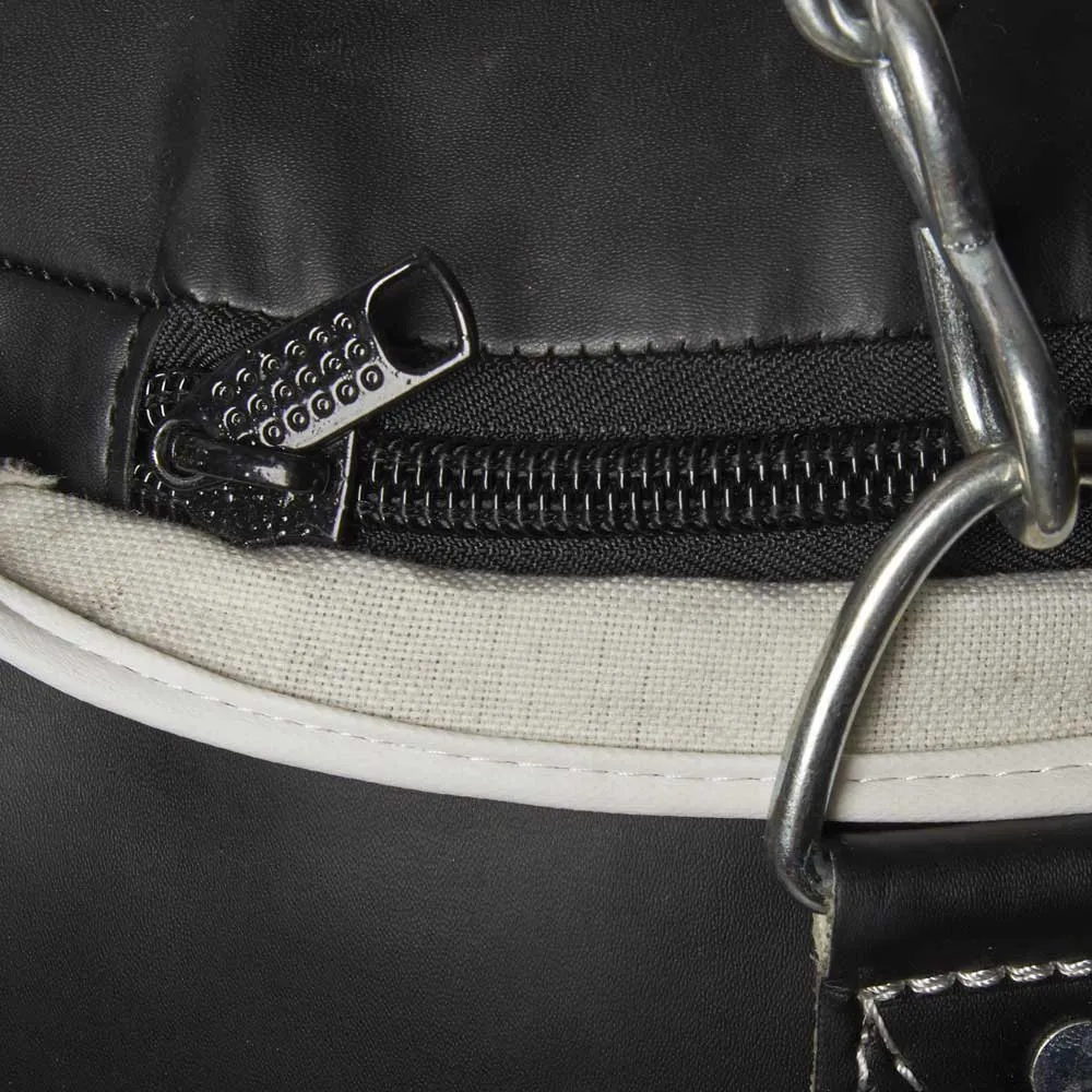 Tillverkad med extra resistent syntetiskt läder, är denna tunga väska en handgjord artikel. Intern vaddering garanterar antisockfunktioner. Den har också en praktisk dragkedja och hängande kedjor.