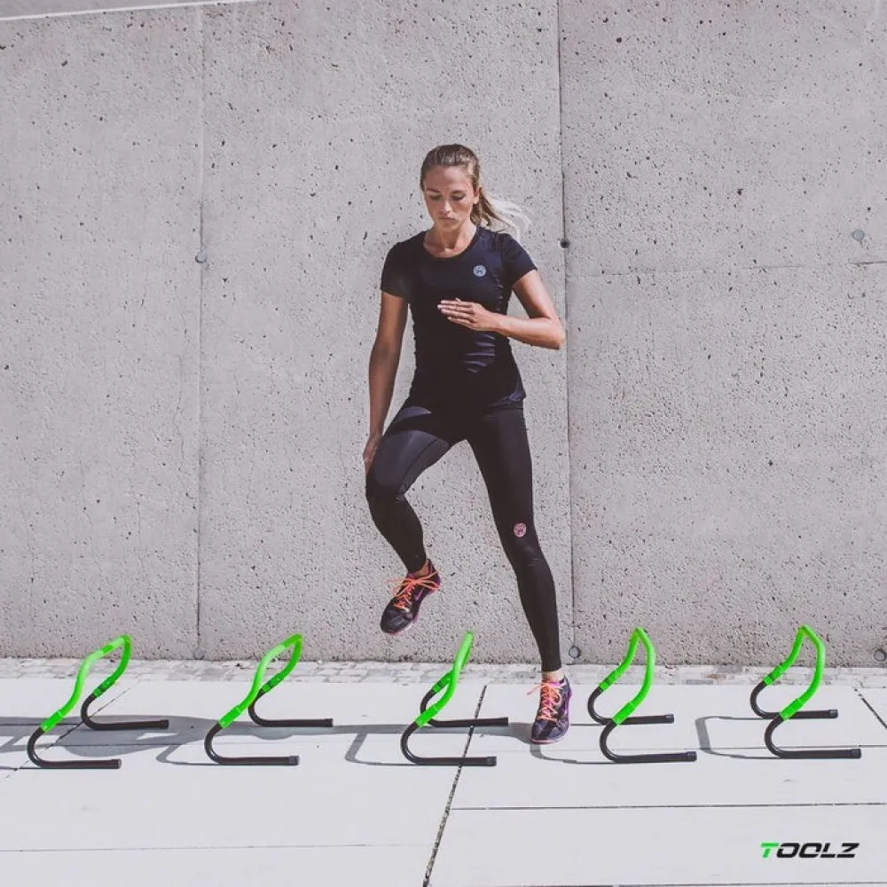 Högre, snabbare, längre: Med TOOLZ träningshinder förbättras fotarbetet, hoppkraften och koordinationsförmågan. Hinder-setet är idealiskt för hopp-, löp- och koordinationsträning för både lag- och individuella idrottare. Hindren kan användas på en mängd olika sätt och hjälper till att förbättra smidighet, explosivitet, reaktionsförmåga och snabbhet.