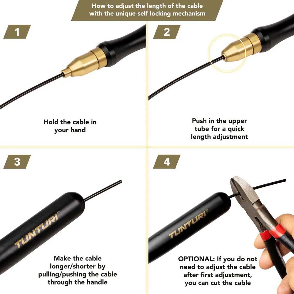 - Stålkabeln är 2,5 millimeter tunn och är skyddad av en PVC-hylsa som gör hopprepet mjukare och bidrar till hållbarheten hos detta premiumhopprep. Det självlåsande systemet gör att repet kan justeras till önskad längd på några sekunder. Handtagen har en bra halkfri beläggning, vilket gör att du inte tappar greppet så lätt. De innehåller kullager som roterar 360 grader för en snabb och jämn rotationshastighet.