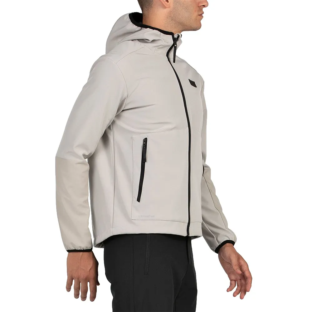 Softshell jakke med hætte i 3L kvalitet med indvendig TPU membran. Vandtæt/Åndbar 3000/3000, indvendig finish i firkantet grid fleece. Manchetter og hætte afsluttet med elastisk kantbånd, justerbar søm med toggles, sidelommer med lynlås.