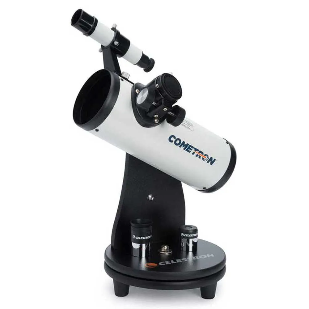 Oplev kosmos med Celestron Cometron FirstScope, et kompakt og letvægtsteleskop perfekt til begyndere. Vær klar til den næste store komet! Dens generøse 76 mm åbning leverer lyse, skarpe billeder af kometer, planeter og tåger, samtidig med at den gengiver Månens kratere i knivskarp detalje. Det brede synsfelt er ideelt til at observere en komets fulde hale eller Oriontågen. Dette transportable bordteleskop er nemt at bruge med opsætning uden værktøj og inkluderer to okularer og en søger for en komplet stjernekiggeroplevelse lige ud af æsken