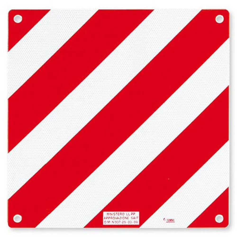 Dette er et ikke-typegodkendt plastskilt til signalering af udragende læs, med fire reflekser Det er en ideel og omkostningseffektiv løsning til brug i lande, hvor et specifikt typegodkendt aluminiumsskilt ikke er et lovkrav, eller til brug på private veje og campingpladser. Kontroller venligst dine lokale og internationale regler, før du rejser.