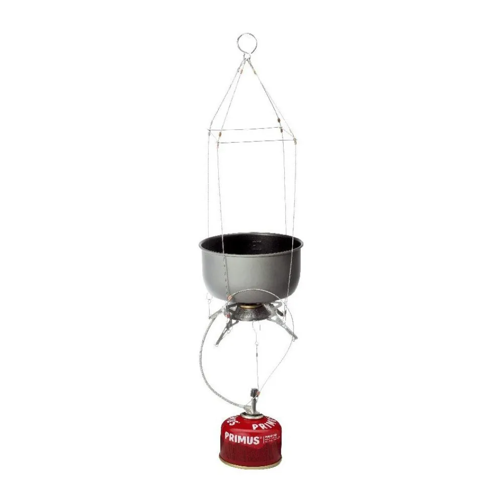Suspension Kit til dem, der ønsker at tage en pause på bjergsiden eller lave mad om bord på en båd. Ledningerne holder komfuret og LP-gaspatronen eller brændselsflasken sammen, men adskilles øverst for lettere at tillade adgang til gryder og pander. Passer til alle Primus komfurer med tre potter. Fås i to versioner til komfurer med tre eller fire ben.
