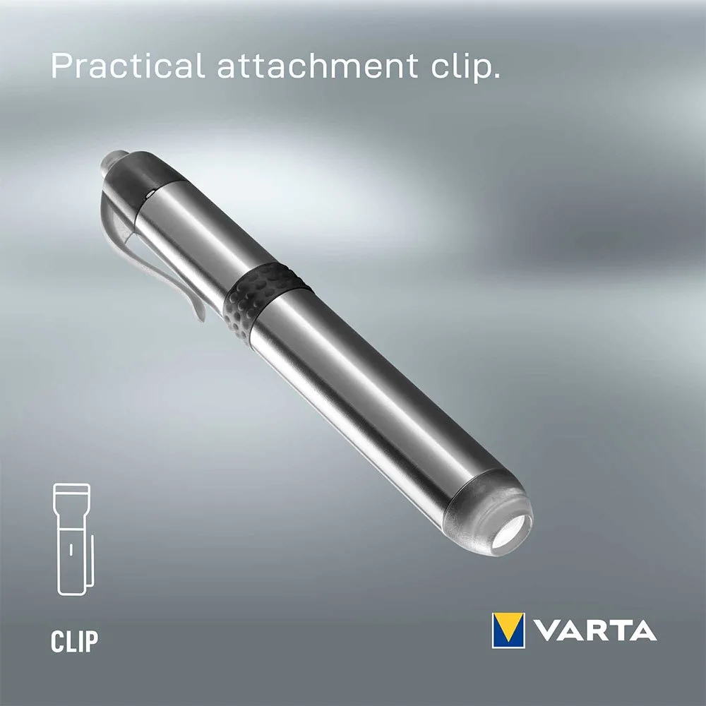 Varta pen lys. ekstremt slank og let lommelygte med aluminiumskabinet. hvid 5 mm led giver en forbedret lysstråle. praktisk fastgørelsesklips. vægt med batterier 27,5 g. længde 117 mm. hoveddiameter 14 mm. stråleområde op til 11m. driftstid op til 15 timer. samlet lysudbytte op til 3 lumen. 1xlonglife power aaa inkluderet.