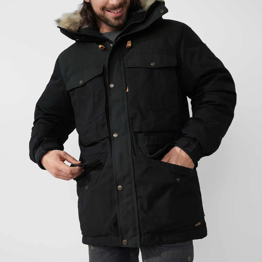 Trotzen Sie den kältesten Wintertagen mit der Singi Daunenjacke, einem aktualisierten klassischen Parka von Fjällräven. Diese warme und strapazierfähige Jacke verfügt über einen traditionellen langen Schnitt aus strapazierfähigem G-1000, verstärkt mit G-1000 HeavyDuty an Schultern und Gesäß. Gefüllt mit ethisch gewonnener Daune bietet sie außergewöhnliche Isolierung für Aktivitäten mit geringer Intensität bei extremer Kälte. Eine schützende Sturmkapuze mit abnehmbarem Kunstfell, reichlich Stauraum in den Taschen und eine verstellbare Passform an Taille, Saum und Ärmelbündchen machen sie zu einer robusten und zeitlosen Wahl für den Winter