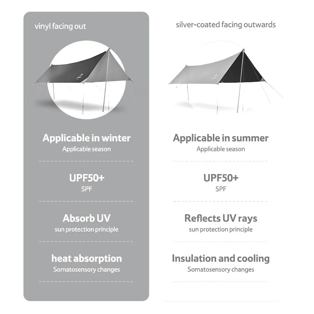 Erhältlich in sechseckiger, kleiner quadratischer oder großer quadratischer Form, ist es aus strapazierfähigem, verschlüsseltem 150D Oxford-Gewebe mit einer Wasserdichtigkeit von PU3000+ gefertigt und bietet hervorragenden Schutz vor den Elementen.