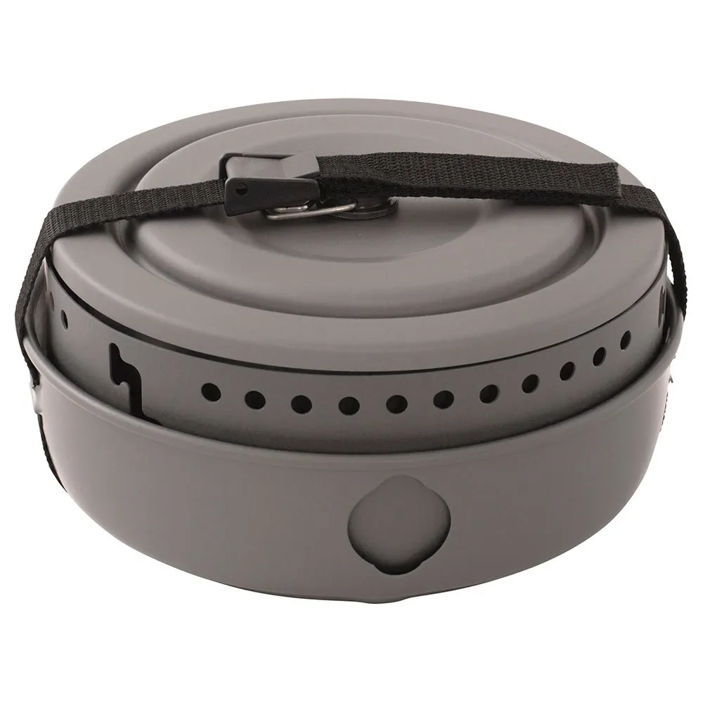 Er ist leicht und robust, besteht aus harteloxiertem Aluminium und wird mit einer antihaftbeschichteten Pfanne, zwei antihaftbeschichteten Töpfen und einem Deckel geliefert.