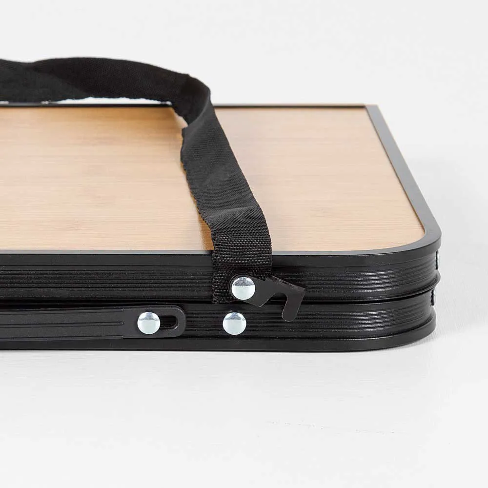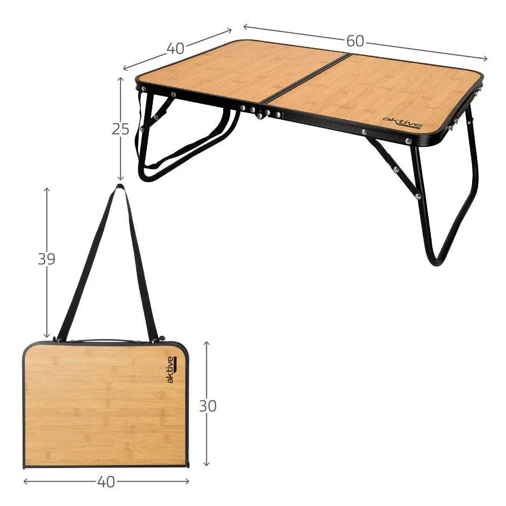 Enhance your outdoor getaways with this Aktive Camping folding table! It is made with a black aluminum structure and its top is made of MDF wood with a bamboo effect.