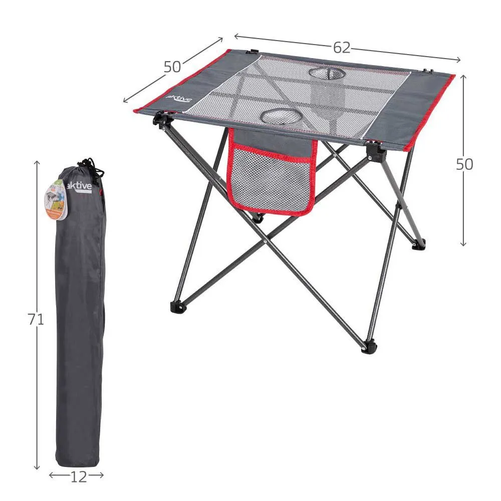 Gray Camping Folding Table with Details in Red Aktive Camping with 2 coasters and lateral grid pocket to save your belongings.
