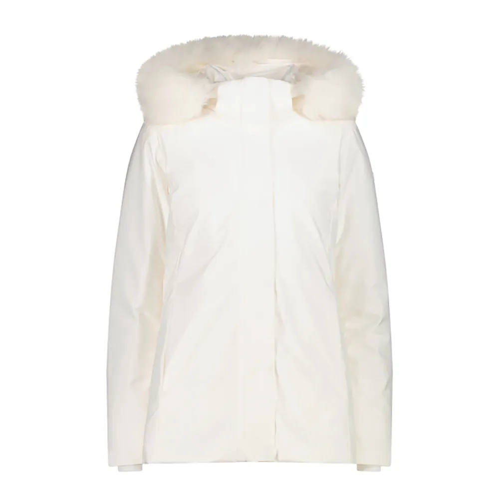 It has a hood with button closure and faux fur finish, which adds warmth and an elegant touch.