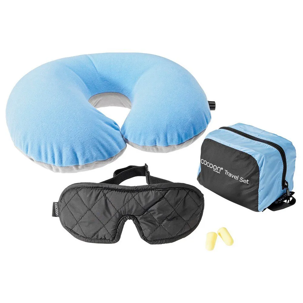 The super-lightweight COCOON TravelSet contains Eye Shades, Ear Plugs, an ultralight Air-Core Neck Pillow and a zippered tote bag with room for other travel accessories.