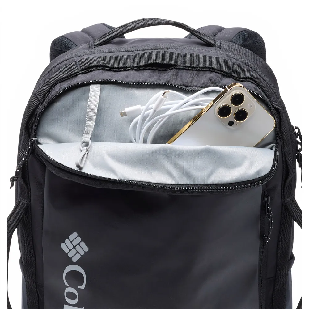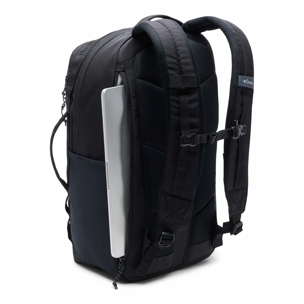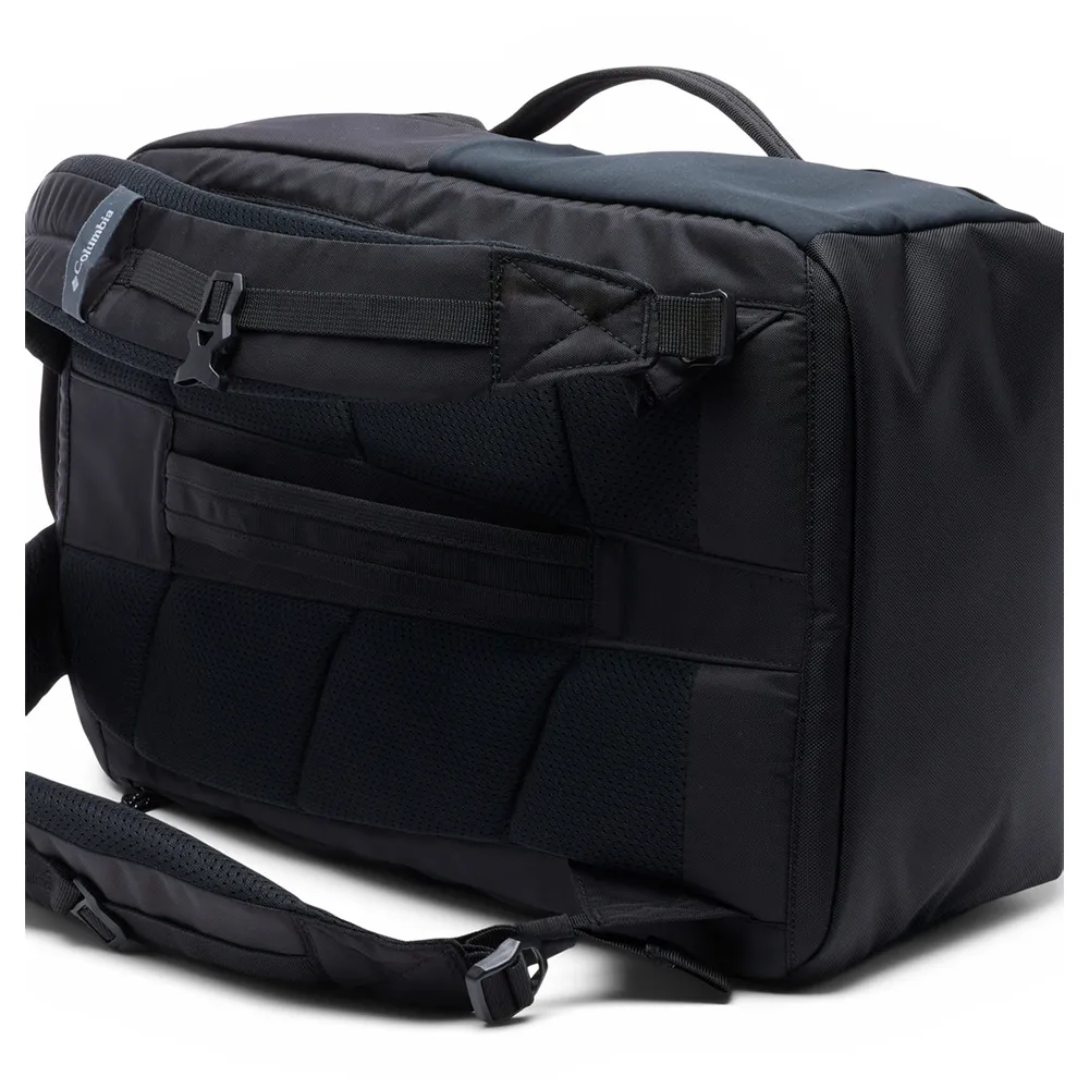 The exterior of the backpack is water-repellent, and the part that touches your back is made of nylon. It´s very comfortable both empty and full. I´ve used it as luggage on weekend flights, and it works perfectly. I take it to the gym every day.