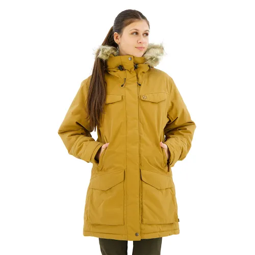 Long, generous parka that reaches down over the rear and thighs. A perfect choice for changeable weather conditions; it protects against the wind and rain and the synthetic padding keeps you warm in really cold temperatures. Fleece-lined storm hood with metal wire and detachable faux fur edging. Eight pockets with plenty of room for essential items. Drawcord at the waist and two-way zipper with protective flap. This is an updated version of Fjällräven’s classic parka, now with sustainable fabrics and improved features and fit.