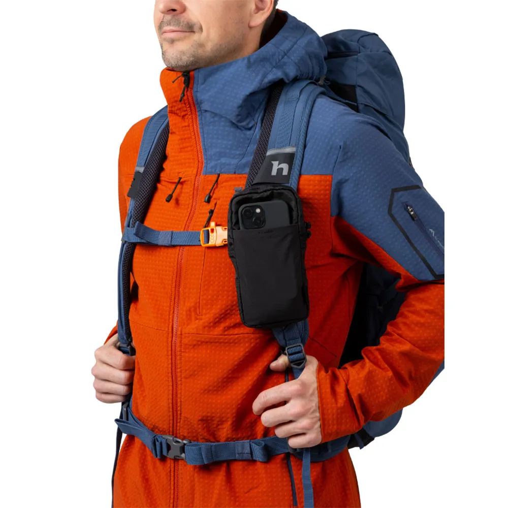 pouch designed for attaching to backpack shoulder strap, top-zip access, inner and outer pocket for cell phone, wallet or snack, compatible with all types of shoulder straps, water-repellent zip.