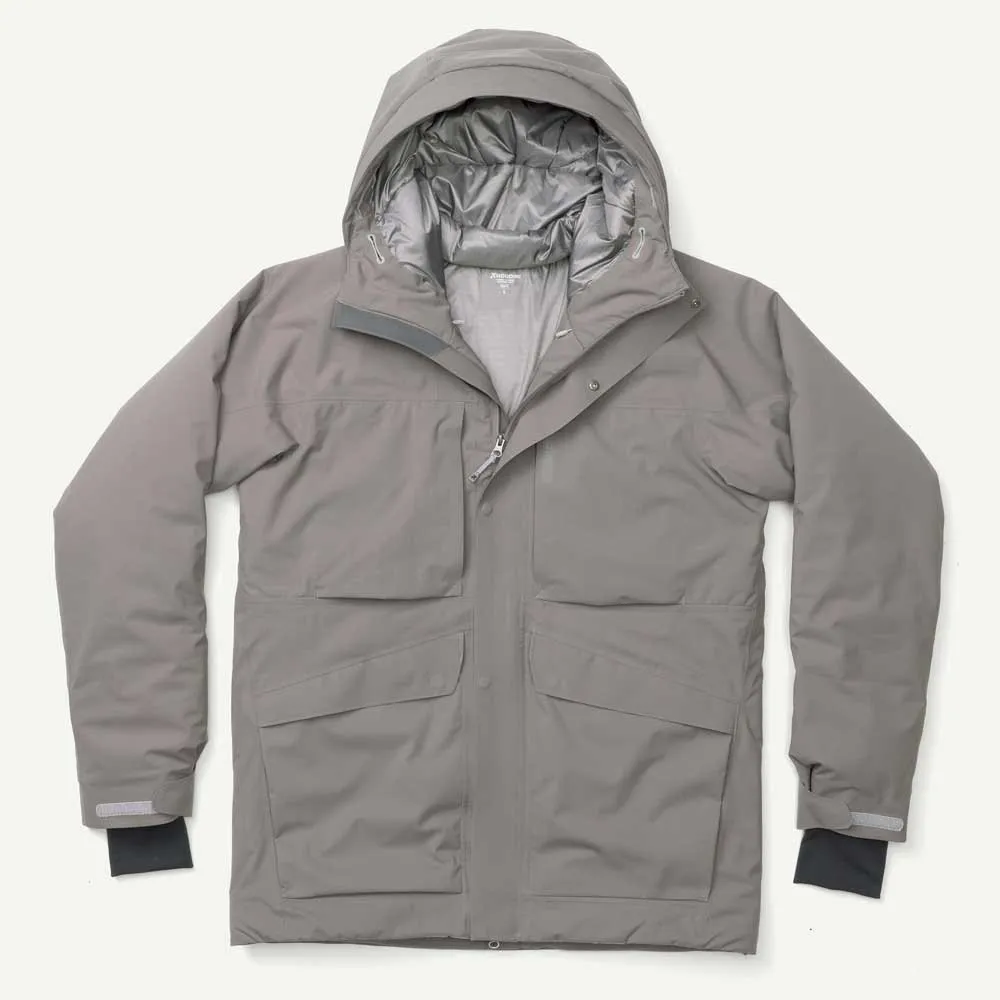 The outer fabric is called Spheric 2 layer Hardshell. It’s fully waterproof and will keep you dry in any rain, snow or sleet. The insulation is Primaloft Silver, a light, warm and highly compressible synthetic padding. We prefer synthetic padding for its performance benefits but also because we don’t believe in stealing the feathers off birds to keep ourselves warm. The Jacket has a large, 2-way adjustable hood and heat barriers around the neckline and bottom hem. You have all the pockets you can ever ask for: Two external chest pockets, two hand pockets, one inside chest pocket and one inside mesh stash pocket.