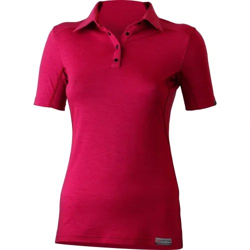 ALISA is a women´s 100% Merino wool polo shirt with short sleeves, a collar and metal snap buttons.