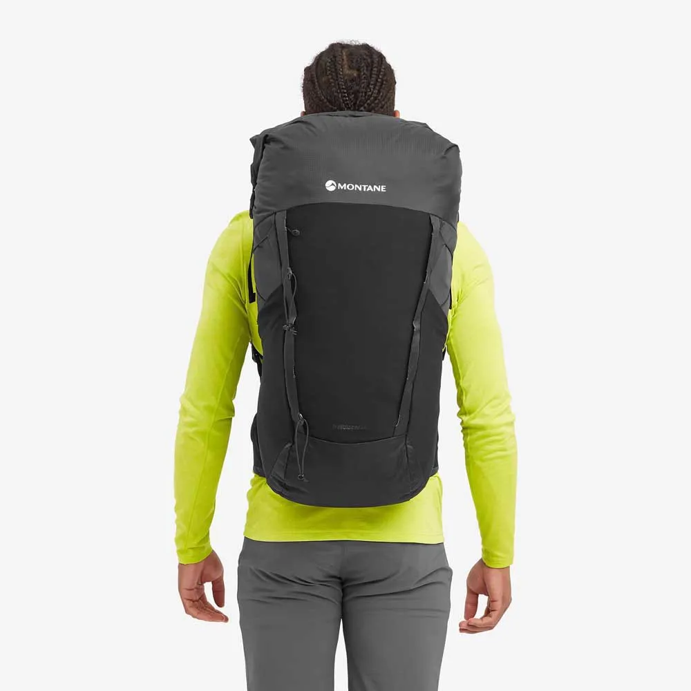 This lightweight but rugged backpack has a precurved, aluminium frame to stabilise heavier loads, and is hydration bladder compatible. It’s packed with easy-to-access storage options, including a large mesh zipped front pocket and mesh side pockets, and the modular Montane T-Hook system adapts to your individual needs, for easy storage of walking poles, spare layers and more.