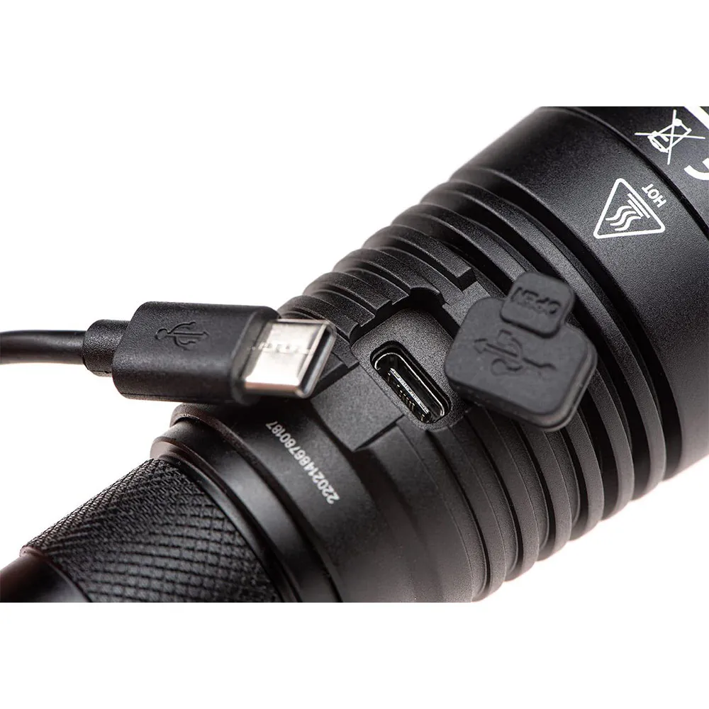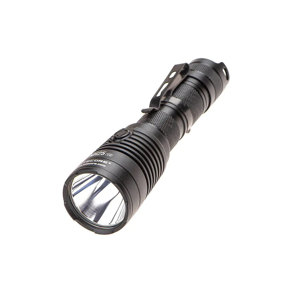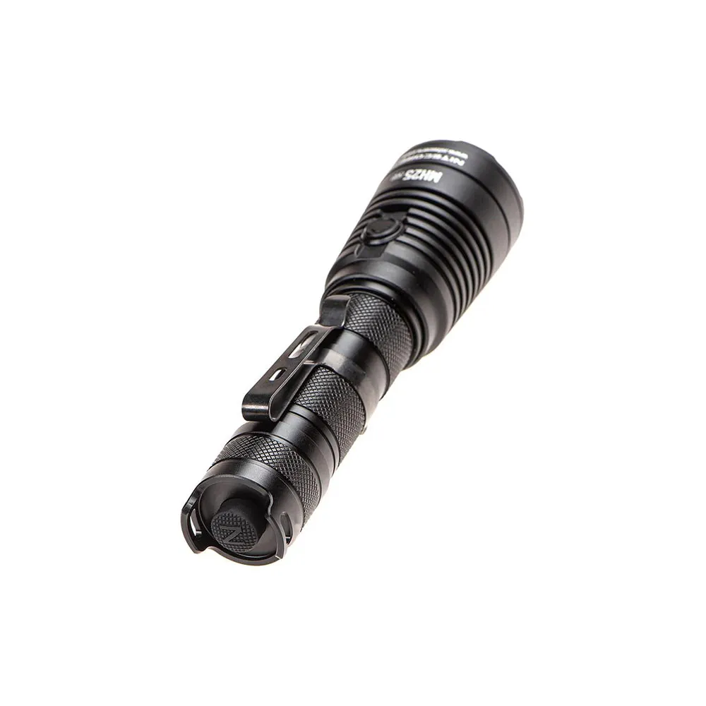 This functional lamp has the CREE XP-L HI V3 LED and SMO reflector. The torch uses a 1x 18650 power cell with a capacity of 3400 mAh or 2x CR123 batteries. It is USB rechargeable safely and rapidly, and the onboard USB charging port is water, dust, and impact resistant. The MH25 V2 can emit up to 1200 lumens, reaching a maximum beam distance of 202m. The device works for as long as 36h in ultralow mode.