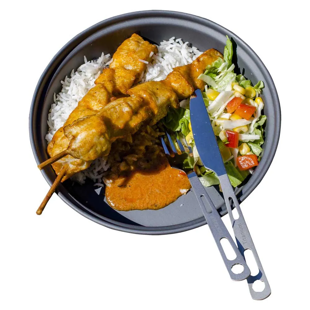 The 2-piece titanium utensil set consists of a full-sized fork and spoon. Both are made of titanium, taking up very little space, and weighing close to nothing. The carved out holes in the handles reduces weight and the choice of titanium adds strength and sturdiness to the construction, both the fork and spoon are equipped with polished eating surfaces and milled handles for a better grip. Both pieces are equipped with an angular hole for the enclosed carabiner, and the printed Nordisk nametag.