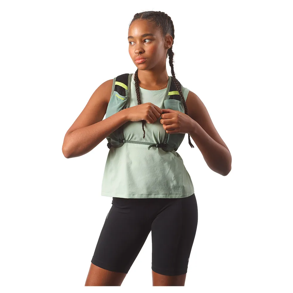 - 2 front flask pockets: Designed to fit Salomon soft flasks, these front pockets limit bouncing. Top elastic loops secure your flasks and keep them ready to drink.