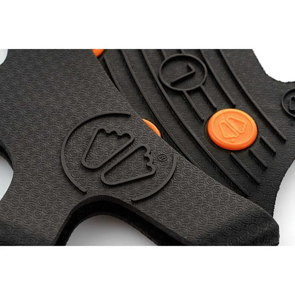 End studs for superior grip, wider stud base for long-lasting hold, thick, hard-wearing rubber, as used in the motor industry (for a better hold on the foot), shaped at the heel for a better fit, Stainless steel stud tips (each pair comes with two spare studs), textured interior webbing for improved grip onto footwear.