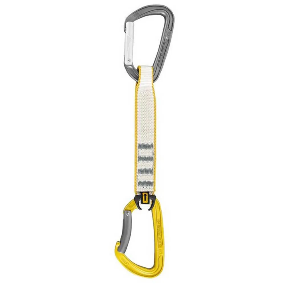- hot-forged I-beam construction makes the biners very light and still extremely strong with 11 kN open gate rating - top straight carabiner equipped with the Keylock system and a special shaped grooves which facilitates clipping and cleaning the bolts - durable easy-to-grab vari-width 16/25 mm polyamide webbing - 17 cm length of the webbing reduces the rope friction in the carabiners when climbing overhanging routes - bottom bent carabiner with the Keylock system for smooth clipping and unclipping the rope - bottom bent carabiner equipped with a rubber fix to hold the carabiner in the correct position and to facilitate clipping the rope - each carabiner is individually tested for the strength 10 kN