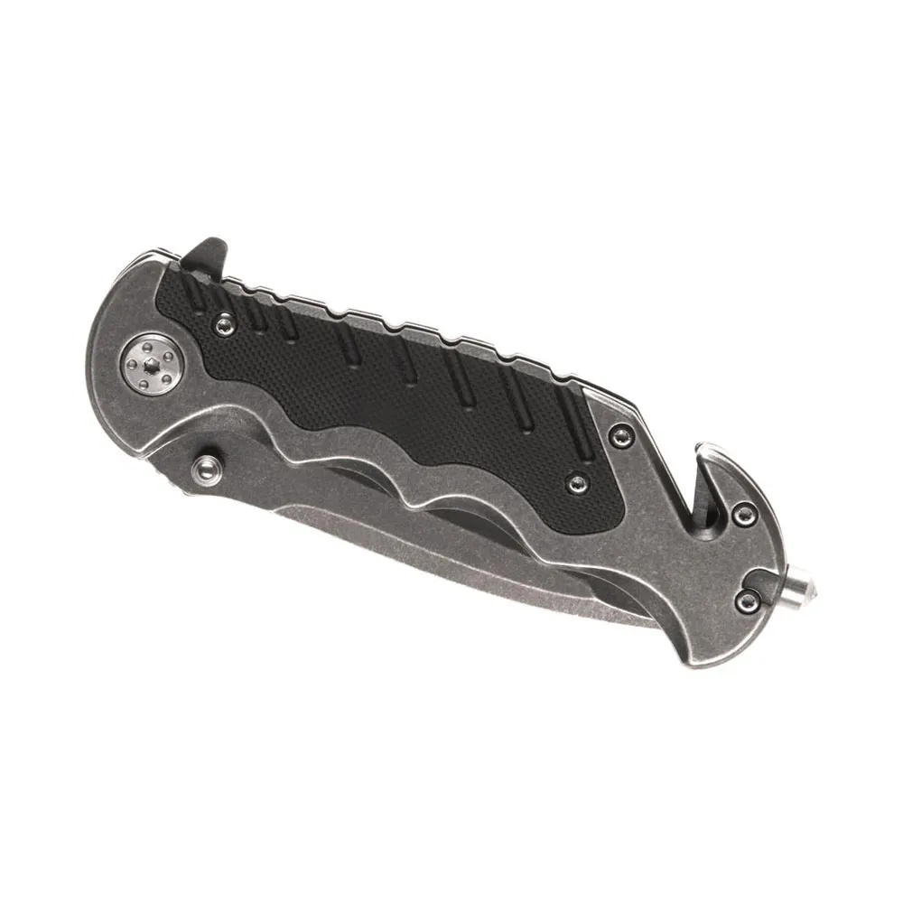 The handle is equipped with a glass breaker, a strap cutter, and a lanyard hole for a safety rope.