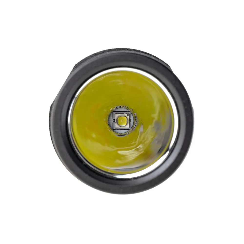 The heart of the flashlight is an LED emitter with a lifetime of 50.000 hours. A Borofloat high-temperature, gasket-sealed lens with an anti-scratch coating protects the emitter. The power output is adjusted with a tail cap push button: