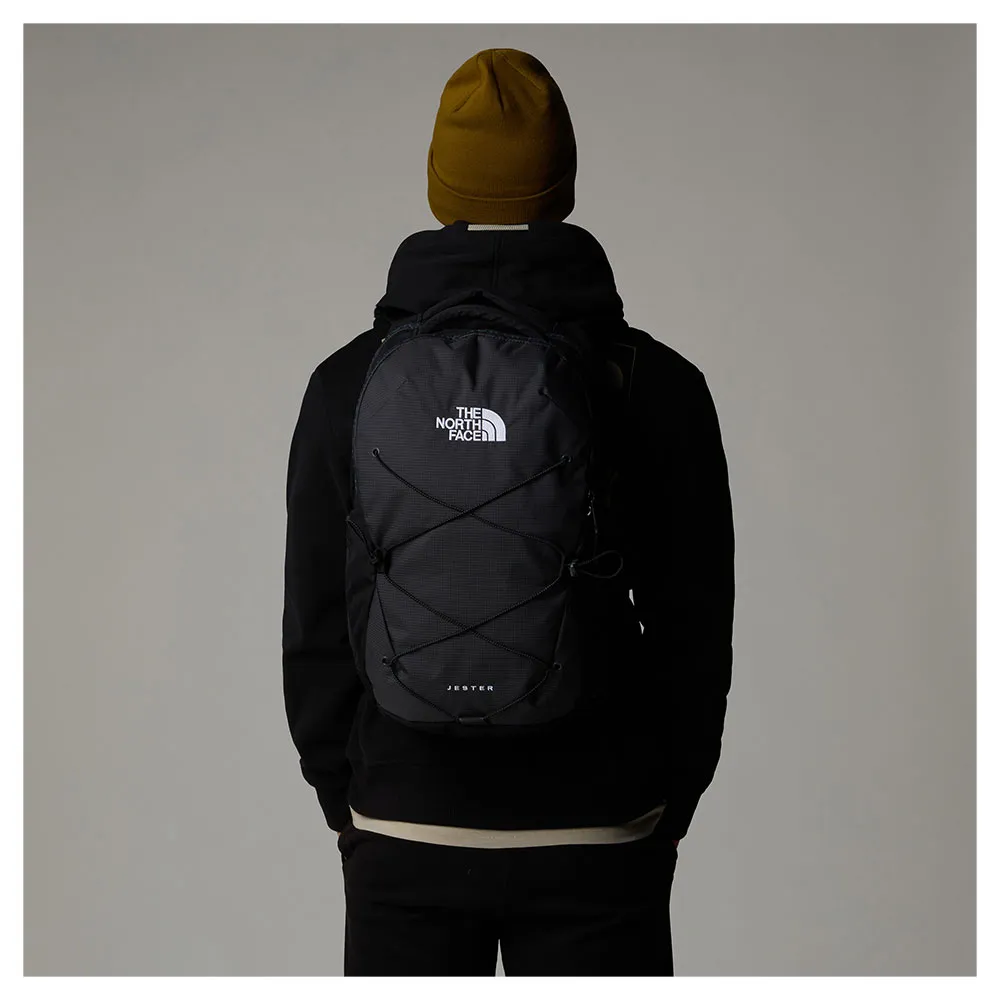 Engineered for comfort and convenience, the classic 28L Jester backpack from The North Face is your perfect daily companion. Endorsed by the American Chiropractic Association, its FlexVent™ suspension system ensures a comfortable carry. The clever stand-up design makes packing effortless. A huge main compartment, a padded 16" laptop sleeve, and a simplified front organization pocket keep your essentials secure. Made from recycled polyester, it also features dual water bottle pockets, a front bungee system for extra storage, and 360-degree reflectivity for enhanced visibility
