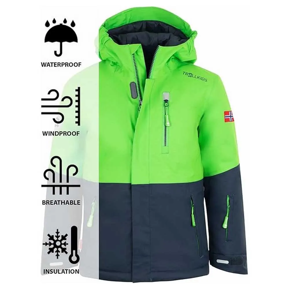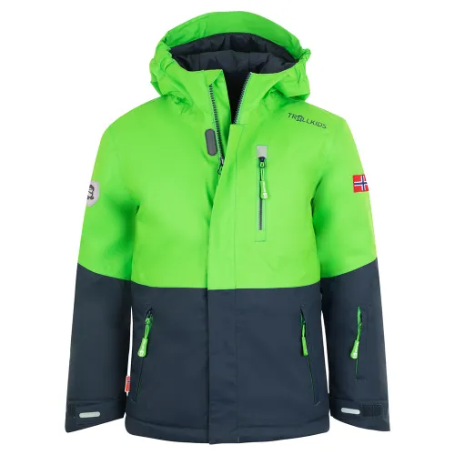 Let your winter warrior conquer the snow with the TROLLKIDS Hallingdal Jacket! Perfect for skiing, tobogganing, or any snowy adventure, this two-tone jacket offers exceptional protection. It’s waterproof, breathable, and warmly insulated with a cozy fleece lining for extra comfort. Packed with essential features like a snow skirt, internal cuffs with thumb loops, and an adjustable hood, it’s designed to keep the cold out. Four zipped pockets secure their treasures, while reflective details ensure they stay visible. It’s the ultimate jacket for fun in the snow