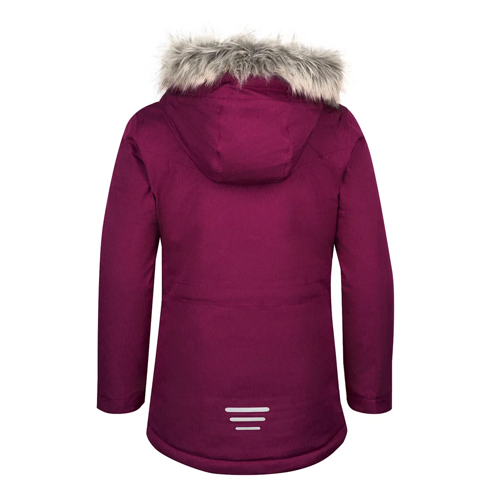 Stylish girls´ winter coat, waterproof, lined, featuring a removable fake fur trim and removable hood.