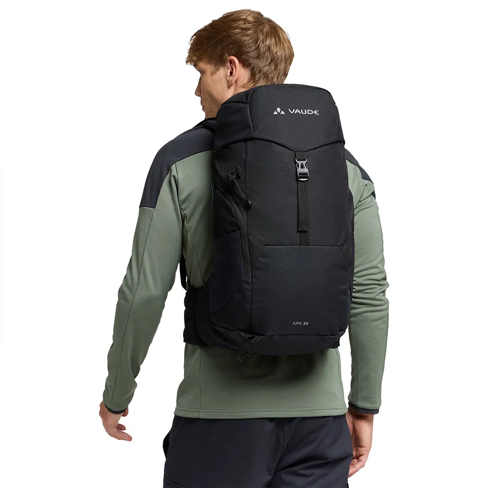 Beyond these core features, the VAUDE Jura 24 is packed with practical details for the modern adult adventurer. It includes a trekking pole attachment point, a clip on the sternum strap for your hydration tube, and an opening for a hydration system (sold separately), ensuring you stay hydrated without breaking your stride. Should the weather turn, a built-in rain cover can be quickly deployed from its dedicated compartment to protect your belongings from a downpour.