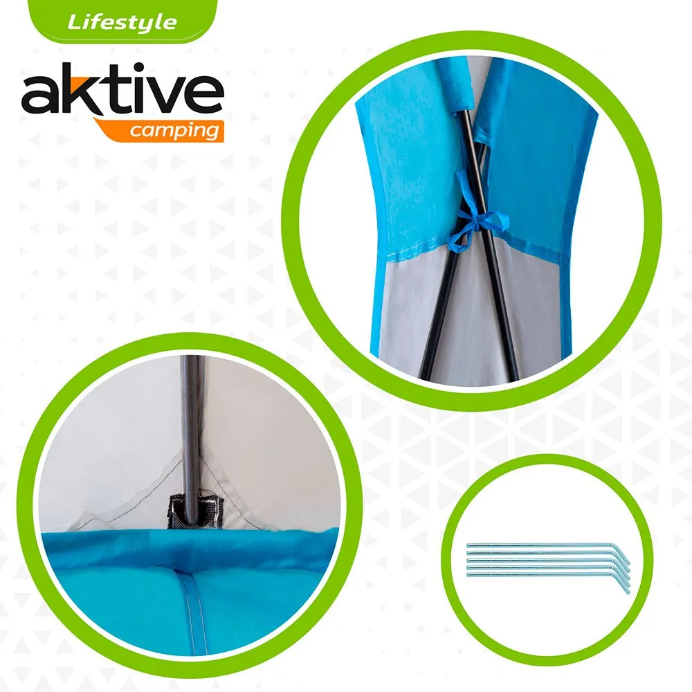 ¡Protégete del sol en tus acampadas con el toldo de camping Aktive! Carpa plegable con medidas 320x320x260 cm, fabricado con tejido impermeable de 190 T de poliéster con estructura de fibras de vidrio de 9,5 cm de diámetro.