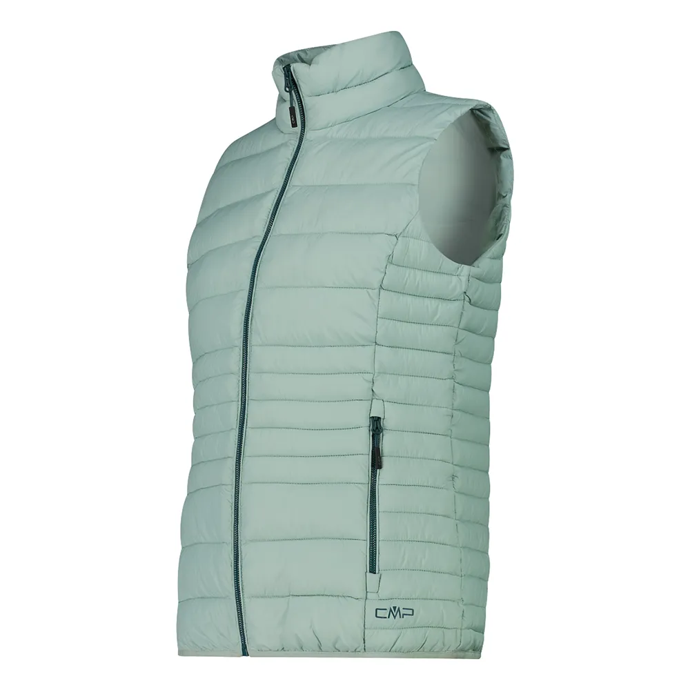 Chaleco de mujer confeccionado con un exterior repelente al agua de color liso, ideal para ofrecer protección contra el viento y la humedad con un estilo esencial y versátil.