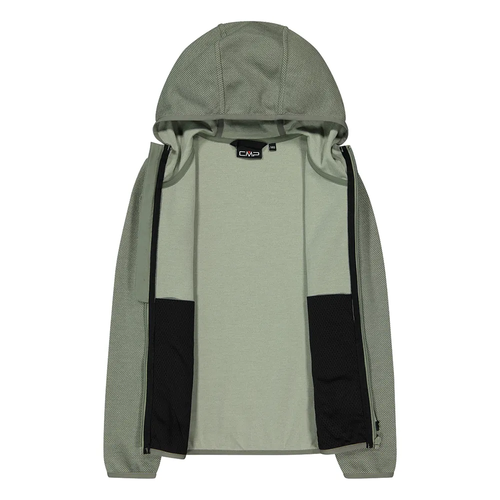Un aspecto técnico para esta chaqueta polar jaspeada con capucha, diseñada para jóvenes entusiastas del aire libre.