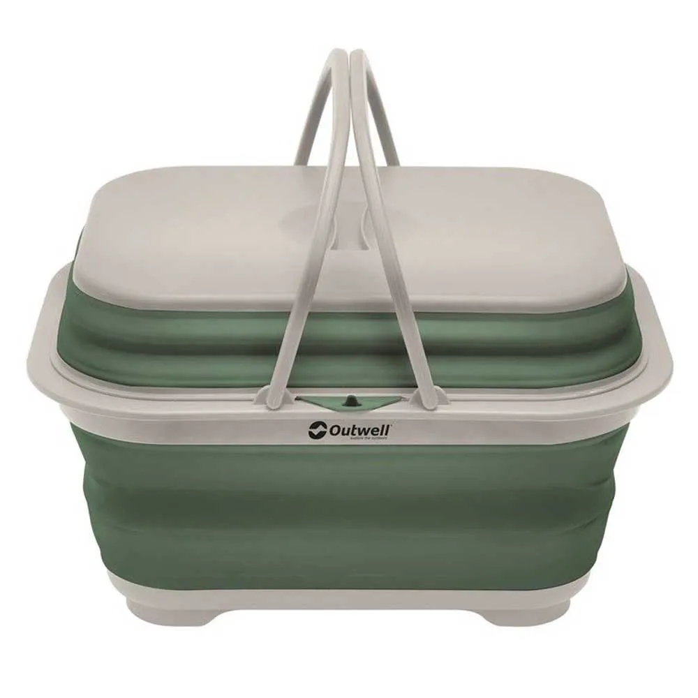 La base de lavado plegable con asa y tapa se pliega completamente cuando no se usa y es ideal para lavar los platos después de una comida.