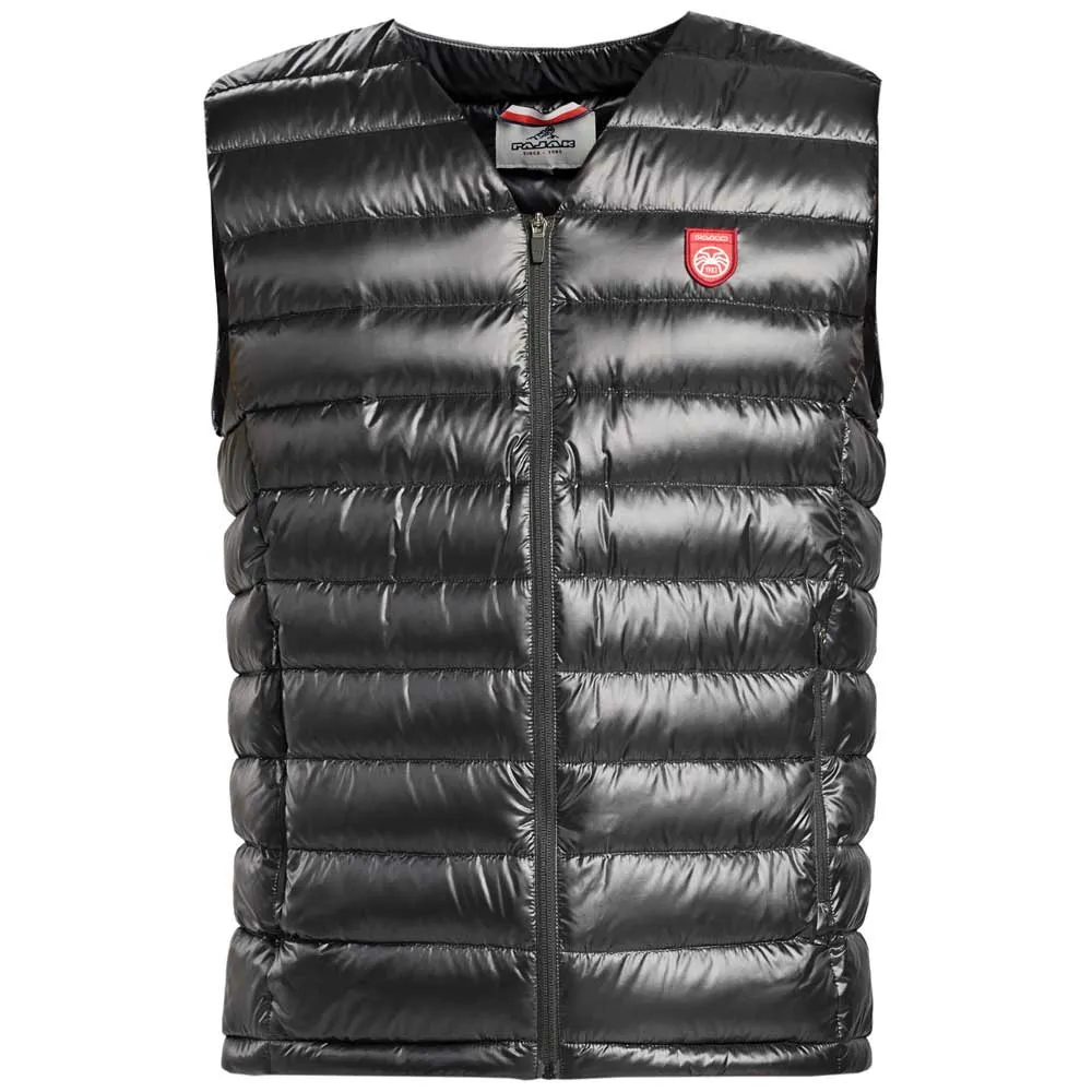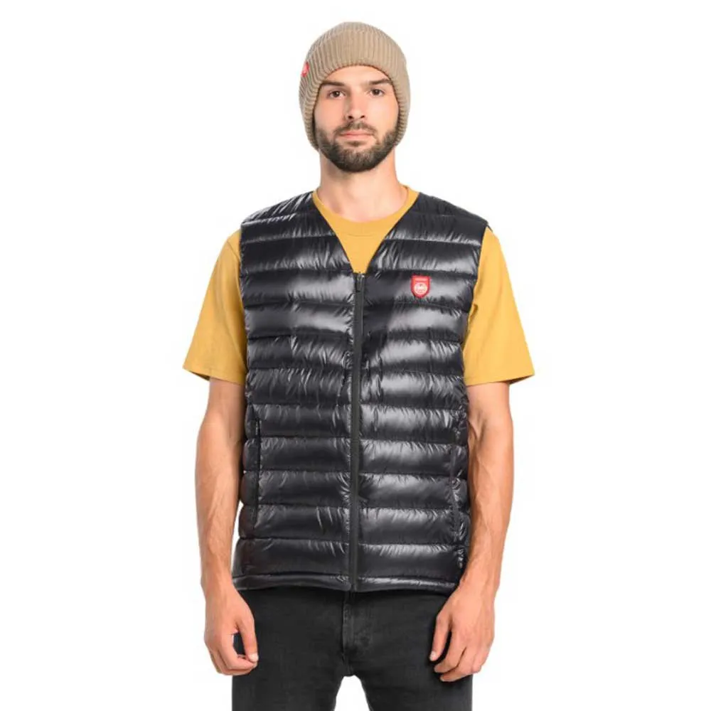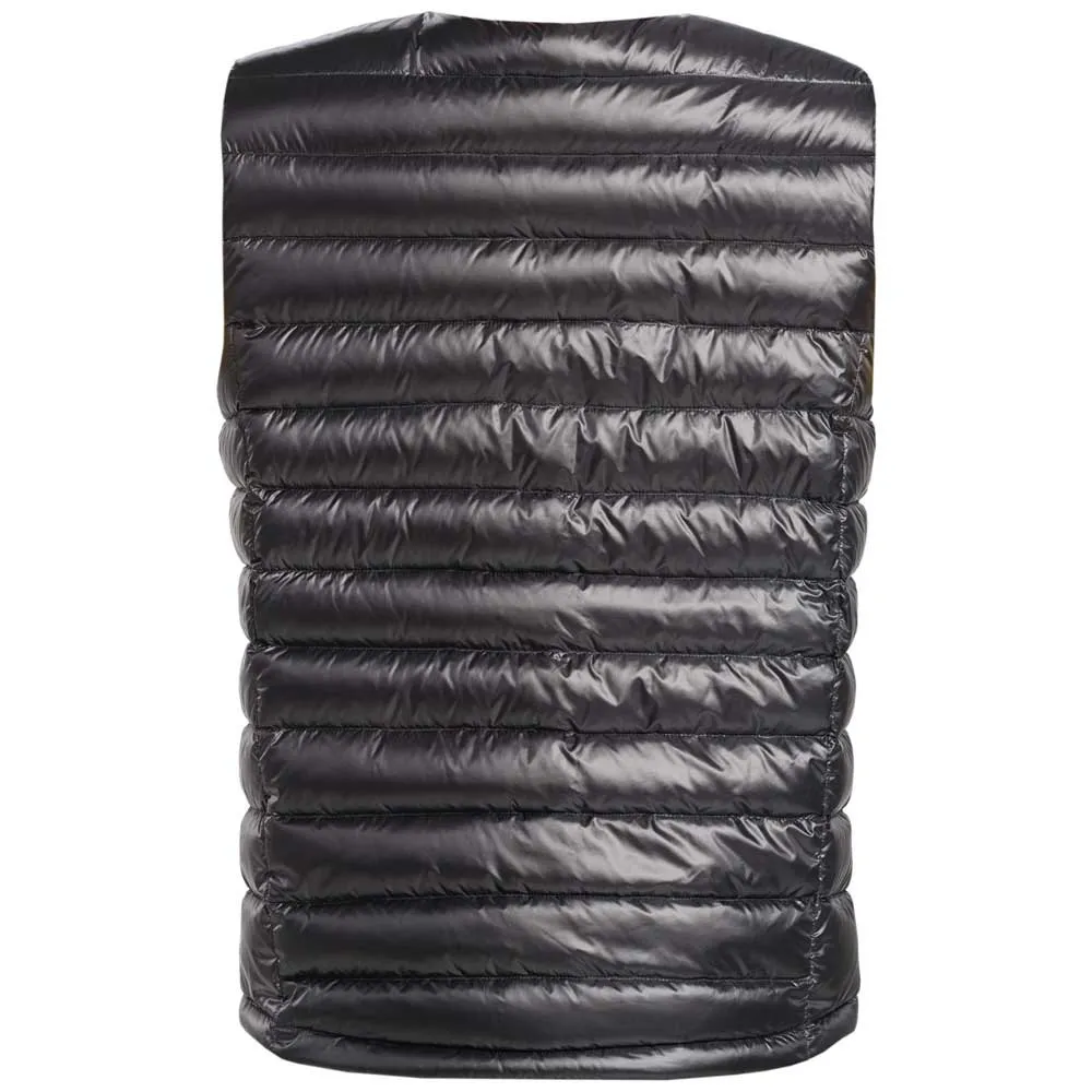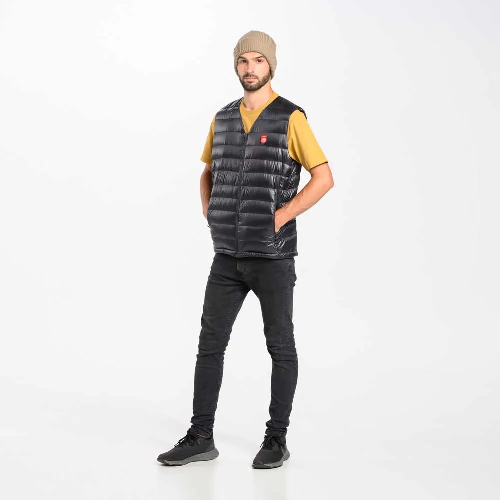 - Tiene un diseño de cuello en V y no tiene cuello, lo que lo hace casi invisible y liviano cuando se usa debajo de una chaqueta o camisa. Está relleno de plumón de ganso blanco pulido de 750FP certificado por RDS, que proporciona calidez e aislamiento.
