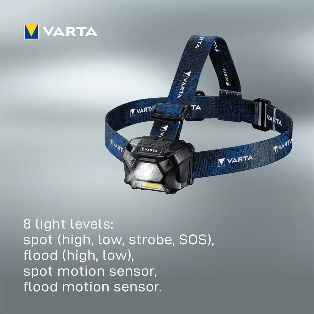 Linterna work flex sensor de movimiento h20 varta. Función de sensor de movimiento pasando la mano frente a la luz. tecnología cob led y 3 w led. 8 niveles de luz a prueba de caídas de 2 m. protección contra salpicaduras de agua y polvo (ip54). diadema ajustable y lavable. Cabezal giratorio para iluminación ambiental ideal. longitud 37 mm. alcance del foco: hasta 78 m. duración: hasta 20 h. potencia lumínica total: hasta 150 lúmenes. fuente de luz: led de 3 vatios.