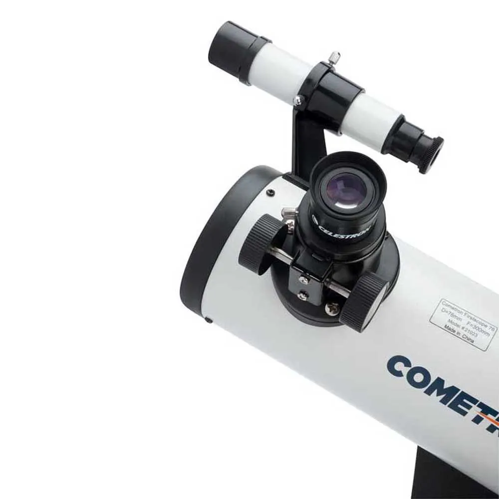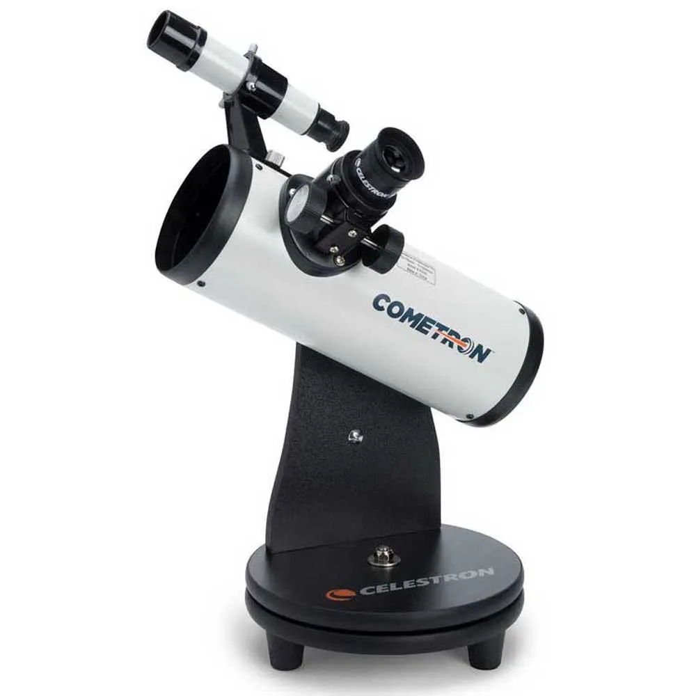 Ole valmis seuraavaan suureen komeetiin Celestronin erikoispainoksen Cometron FirstScope -teleskooppiin, joka on kompakti ja kevyt teleskooppi, joka sopii täydellisesti aloittelijoille, jotka haluavat kokea komeetan, planeetan tai sumun taian. Tämä pöytätaso Dobsonian -tyylinen teleskooppi sisältää pallomaisen peilin, jossa on runsas 76 mm aukko. Cometron FirstScope tarjoaa kirkkaita ja teräviä näkymiä komeetoille ja muille taivaallisille kohteille sekä esittää Kuun vuoret ja kraatterit terävissä yksityiskohdissa. Ja laajan näkökentän ansiosta voit havaita komeetan kirkkaimman osan ja sen hännän tai suosikki syvän taivaan kohteet, kuten Orionin sumun.