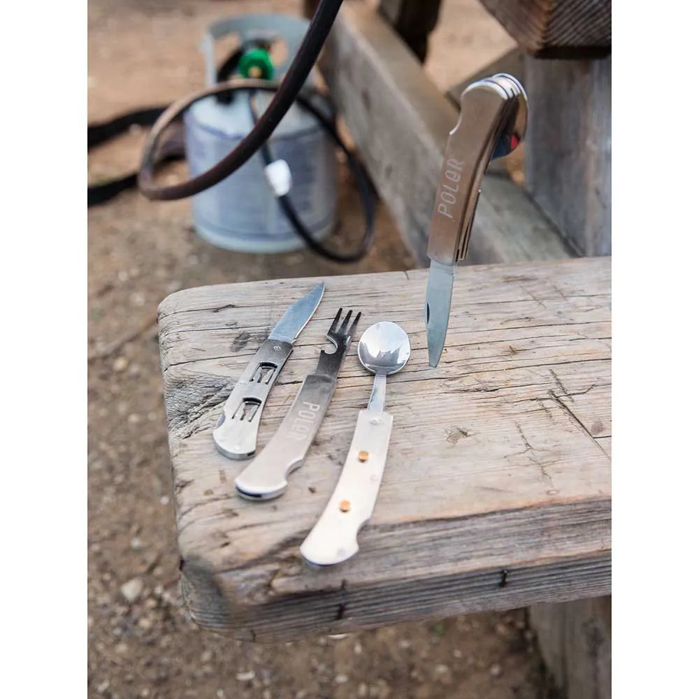 Notre couteau Nobo est un chef-d'œuvre 4 en 1. Il se démonte facilement en une cuillère, une fourchette, un couteau et un ouvre-bouteille.