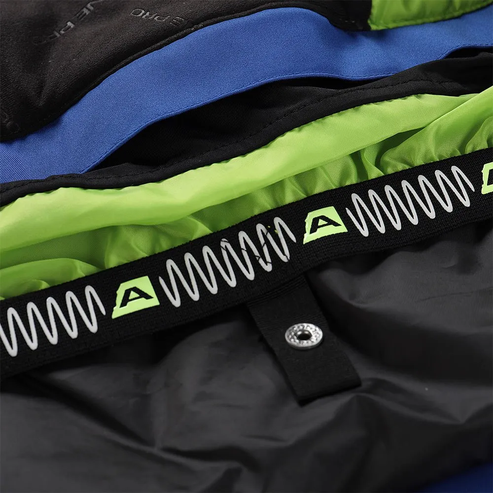 Non solo sugli sci, puoi utilizzare la ventilazione sotto le ascelle con cerniere, una cintura da neve elastica, la possibilità di attaccare i pantaloni alla giacca con anelli e una parte posteriore allungata con una regolazione della larghezza elasticizzata.
